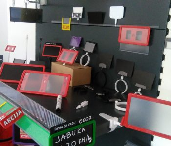 Pratite trendove tržišta i najuspješnijih trgovačkih lanaca tako što ćete što prije početi direktnu komunikaciju sa vašim kupcima kroz označivače akcija, roba i noviteta. Nudimo vam više tipova označavanja u prodajnim objektima tako što podjednako obraćamo pažnju i na vertikalnu i na horizontalnu komunikaciju. Najćešća horizontalna komunikacija je različitim voblerima na policama, kasetnim cjenovnicima na voću i povrću te prstenastim, igličastim ili stopnim nosačima folija u rashladnim uređajima za direktnu promociju artikala.